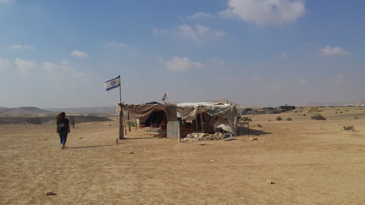 מאהל בדואי המחכה לעולים ממדרשת שדה בוקר בדרכם לעין עקב במסלול הסרפנטינות – הדגל אמור לשדר תחושה ביתית למטיילים